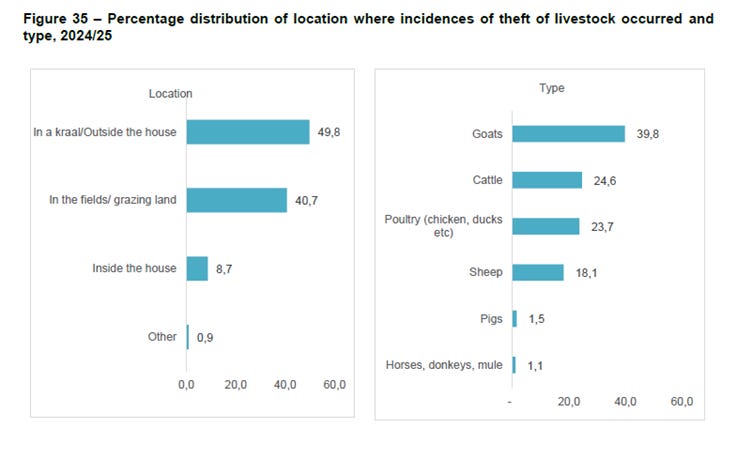 Statistics South Africa also provided a valuable table (see below) that illustrates the locations where theft of livestock occurred and the type of livestock that was stolen in 2024/25.